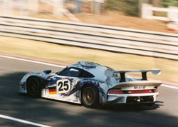 The 911 GT1's debut was at the BPR Global GT Series at Brands Hatch, where Hans-Joachim Stuck and Thierry Boutsen won comfortably. They followed up by winning at Spa and Ralph Kelleners and Emmanuel Collard triumphed for the factory team at Zhuhai. The '96 GT1 was clocked at a top speed of exactly 330 km/h (205 mph) on the legendary Mulsanne Straight in the practice sessions of the 1996 Le Mans 24 Hours Race (presumably on a low downforce setup). The car was in effect Porsche's answer to the McLaren and it was to change the face of GT racing forever. Perhaps the factory hoped that road-going cars, modified to race, would really be the answer, but the McLaren was so far ahead of anything else for the road that desperate measures were called for. These measures resulted in the 911 GT1. First raced at Le Mans, they came tantilisingly close to taking victory in the 24 hours and were so successful in subsequent BPR races that the FIA imposed draconian restrictions on turbocharged cars for 1997.