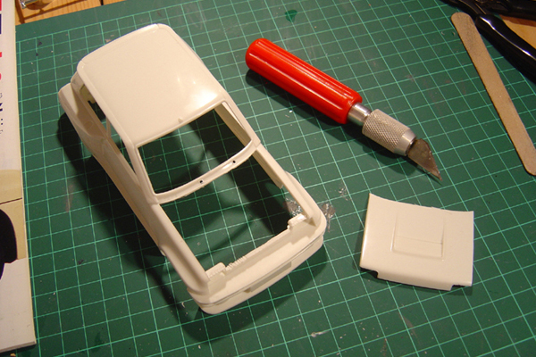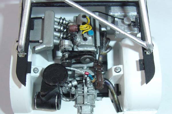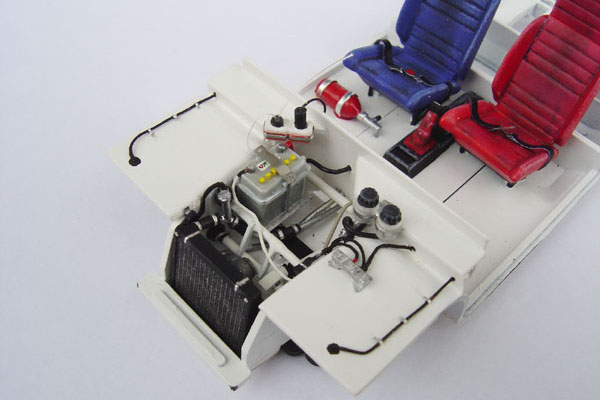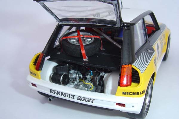 The original Tamiya kit is a curbside version however I decided to open both the bonnet and rear hatch to reveal a fully detailed engine in the rear and ancilliary components such as radiator, battery, coolants etc are under the bonnet. A trip to the Festival of Speed last year gave me the idea for this project and I managed to get a considerable number of reference pictures of the actual vehicle on the Renault motorsport stand. Upgrade items from Studio 27 & Acu-stion and further items from Scale Motorsport as well as numerous scratch built parts were used to enhance the details of the model.