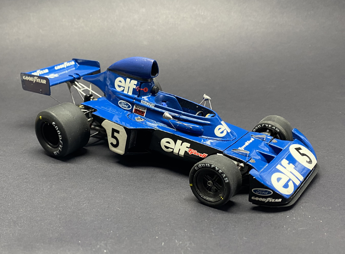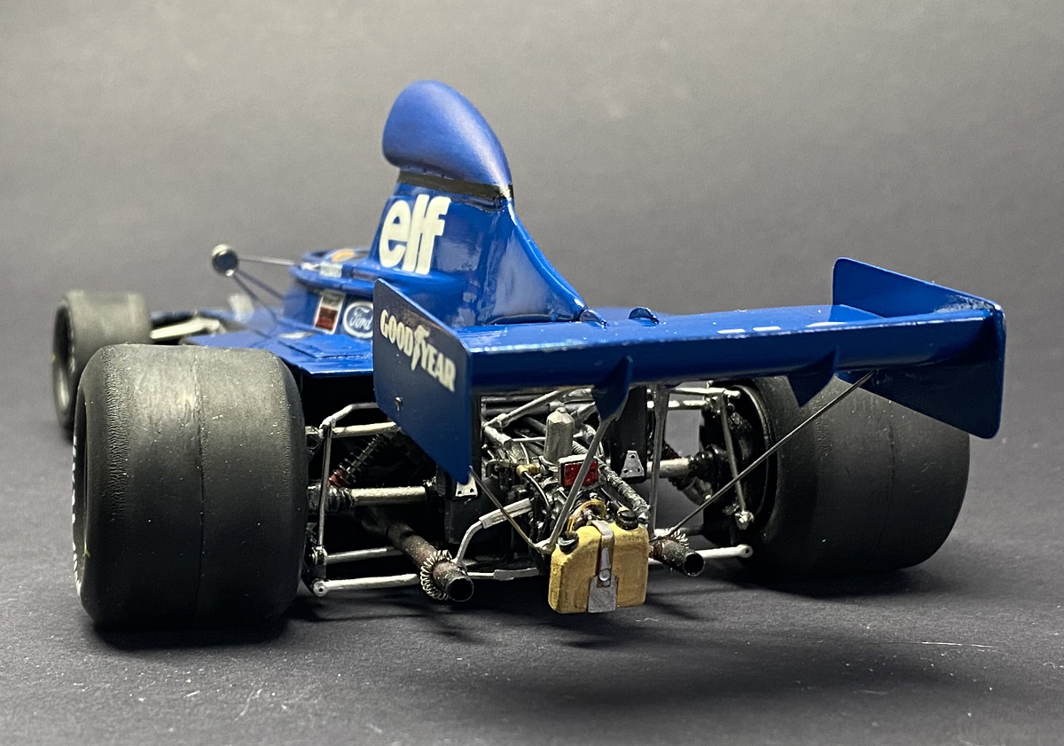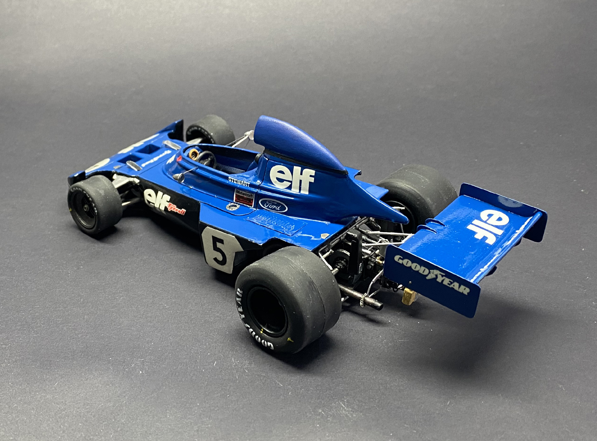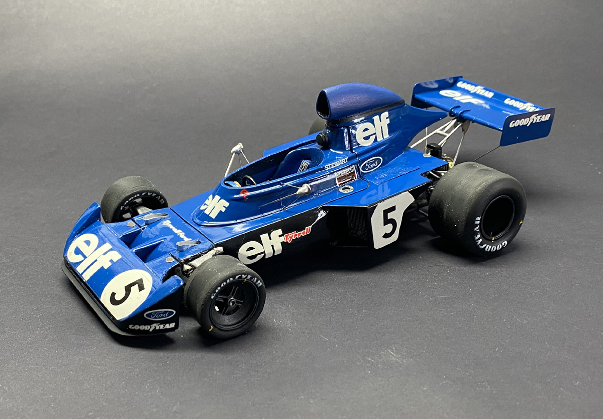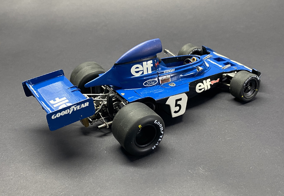 The build is of the 1973 car driven by Jackie Stewart at the Monaco GP, a race he won. It is a resin kit by Ace Models and required some substantial alterations in order to achieve an acceptable finish. I reworked and sratch made most of the cockpit details, transmission and engine details, and scratch made the rear wing support.