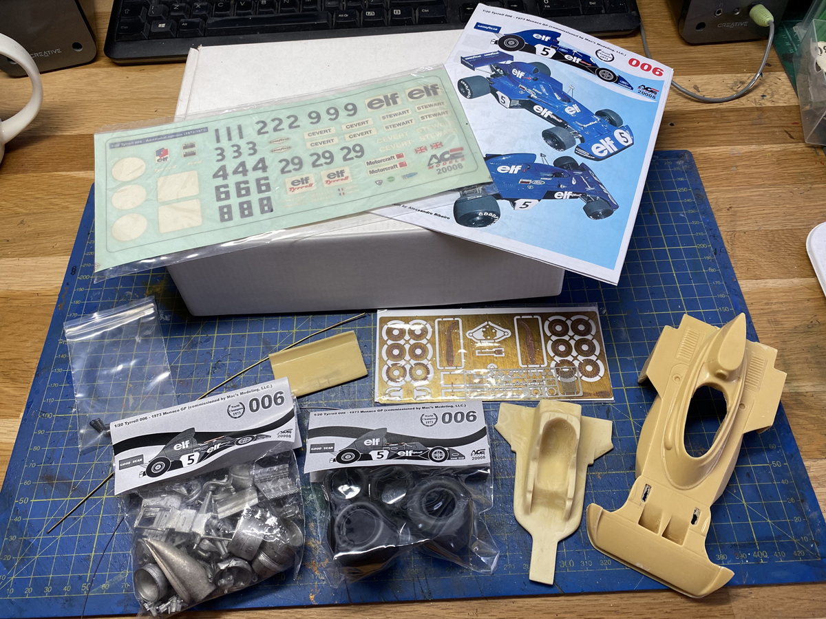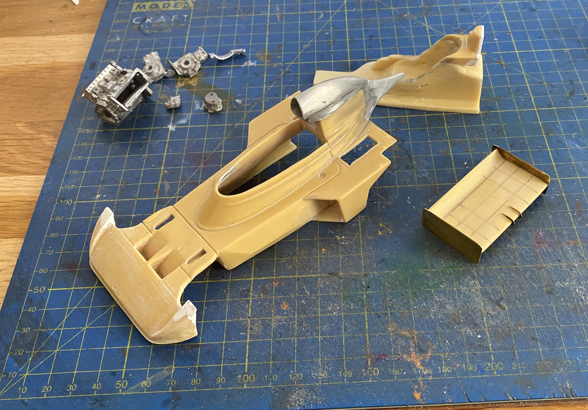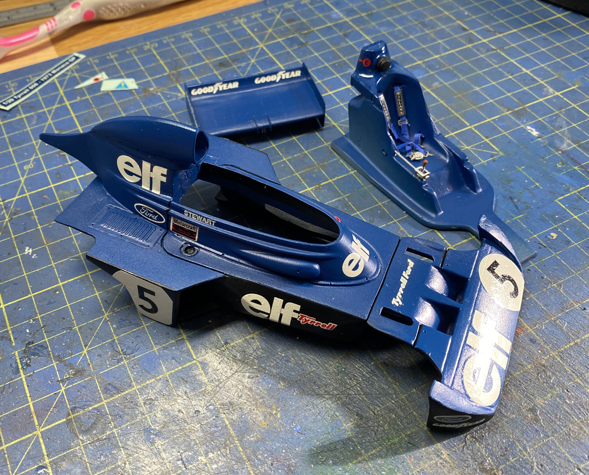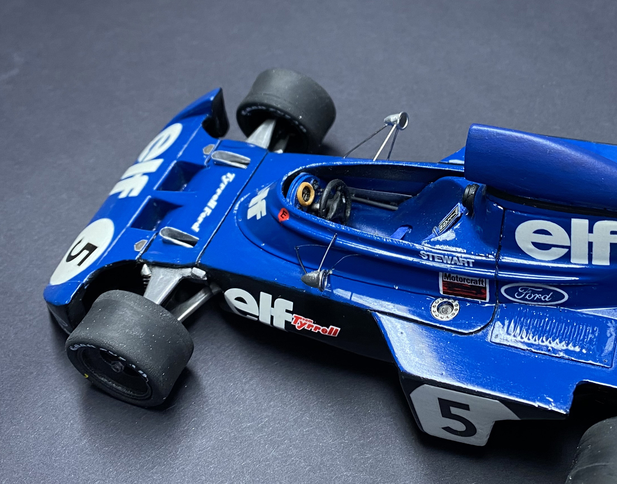 The build is of the 1973 car driven by Jackie Stewart at the Monaco GP, a race he won. It is a resin kit by Ace Models and required some substantial alterations in order to achieve an acceptable finish. I reworked and sratch made most of the cockpit details, transmission and engine details, and scratch made the rear wing support.