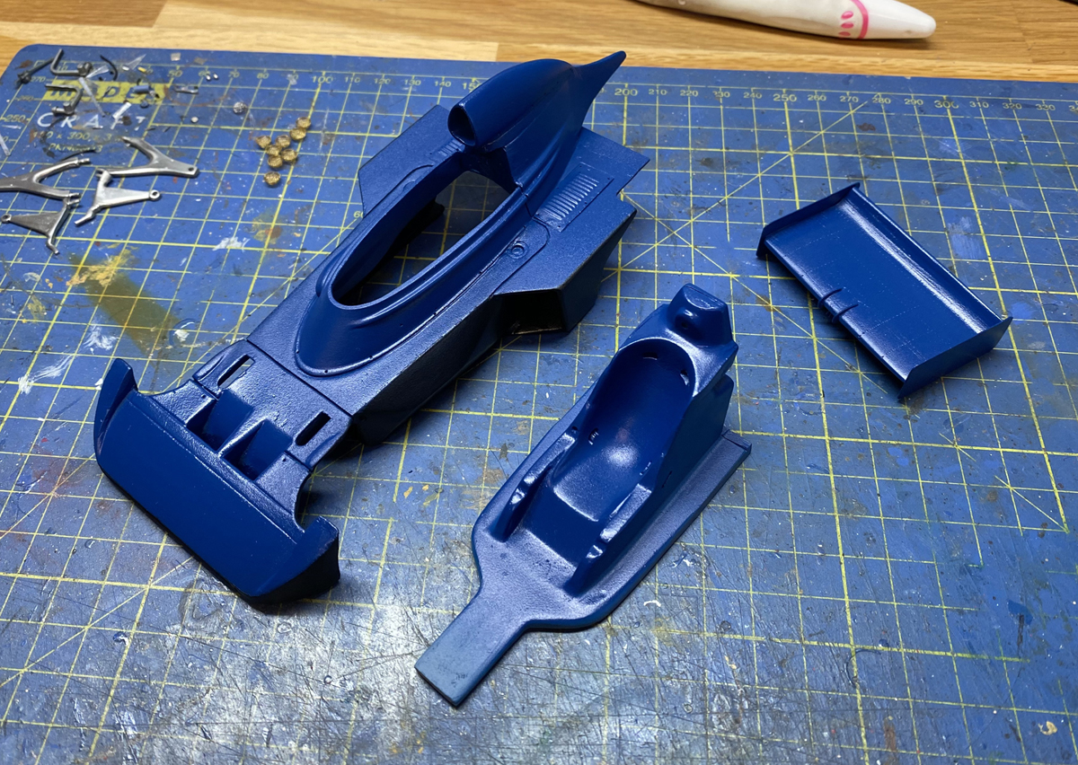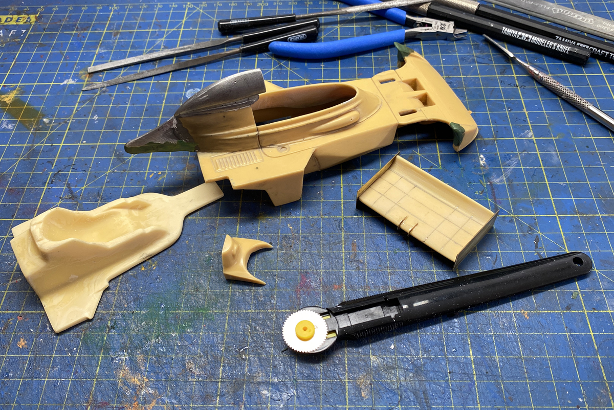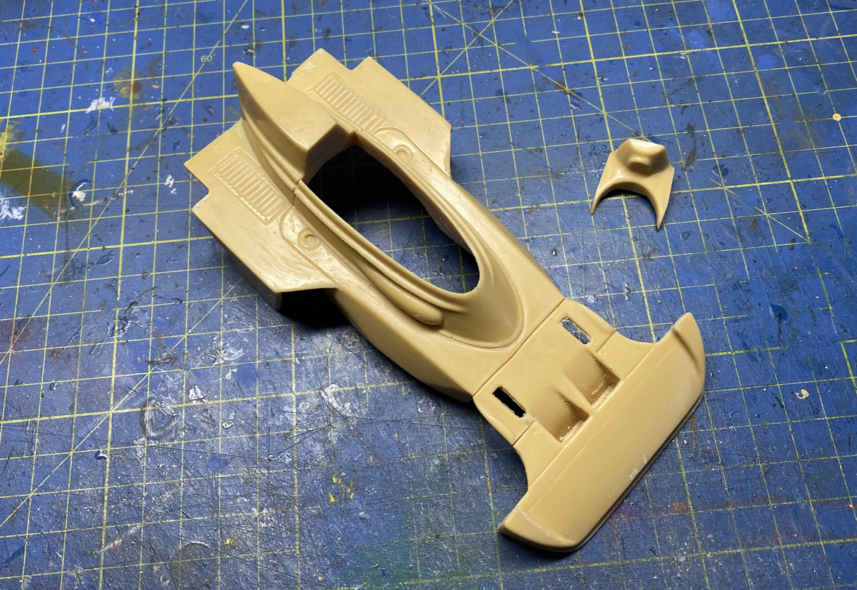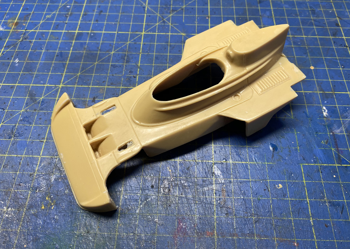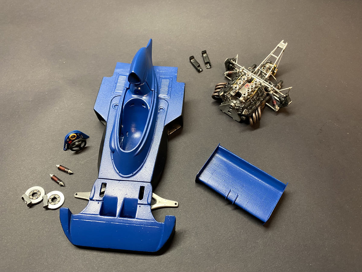 The build is of the 1973 car driven by Jackie Stewart at the Monaco GP, a race he won. It is a resin kit by Ace Models and required some substantial alterations in order to achieve an acceptable finish. I reworked and sratch made most of the cockpit details, transmission and engine details, and scratch made the rear wing support.