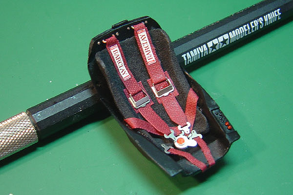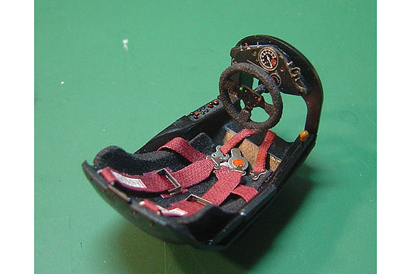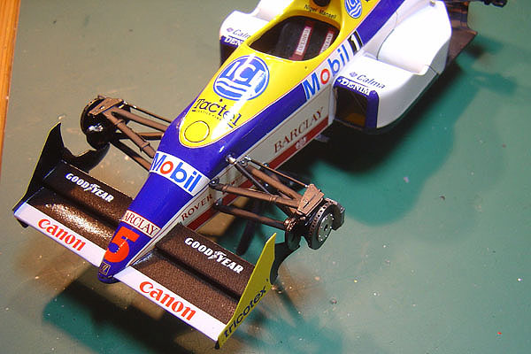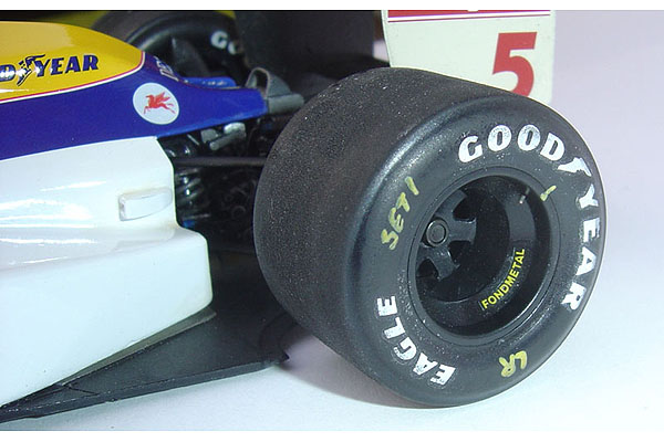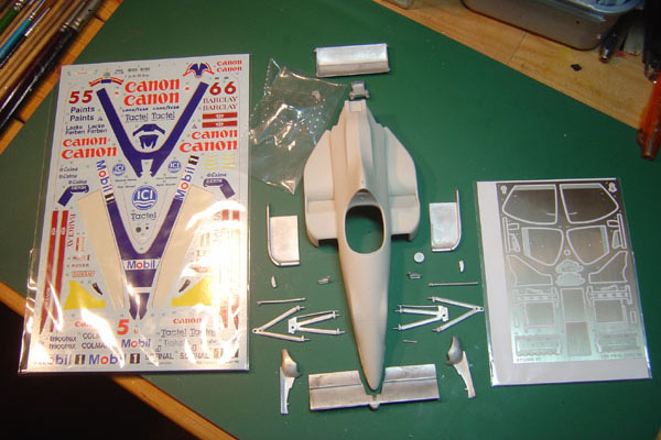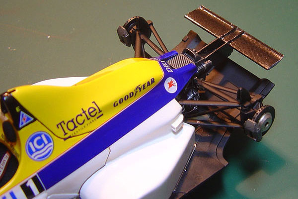 Studio27 produced the transkit for this car and the main kit is taken from the Tamiya FW13B. I added very little in terms of further details. Both front and rear suspension arms have brake cables added to them, I have scratched some new rear suspension units and added a couple of cables and hoses around the transmission. The drivers cockpit has seat belts added in the usual way and I have used some flocking for the seat, headrest and steering wheel.
